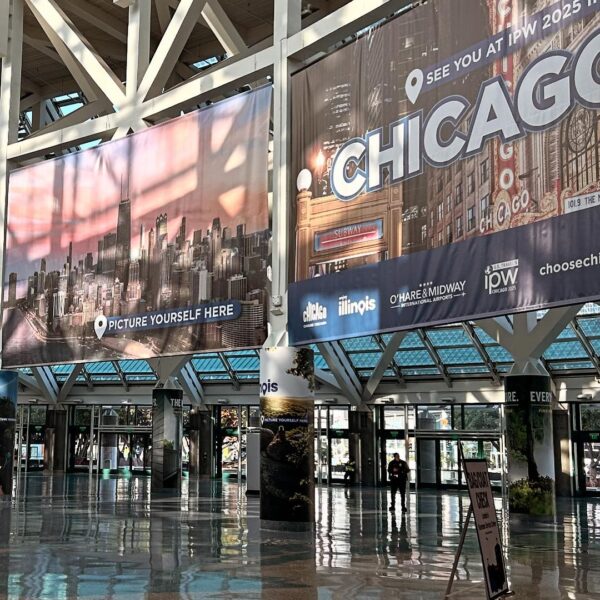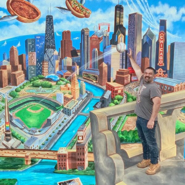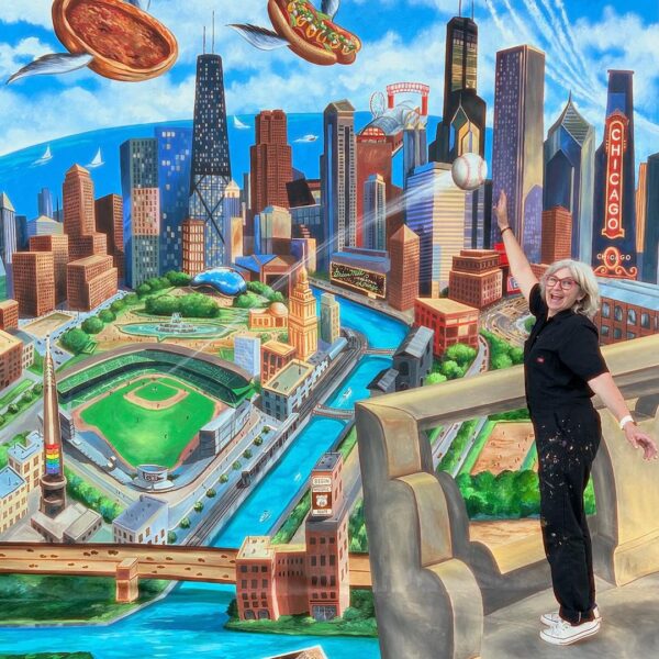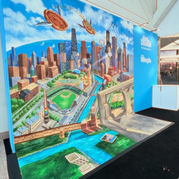 This hand-painted installation was created to promote the city of Chicago at IPW 2024 in Los Angeles. Our client was Choose Chicago. Our objective was to bring all the iconic references to the city into our painting, with guests standing on the terrace of the Wrigley Building, ready to catch a ball out of Wrigley Stadium. We’ve got both ends of Route66 covered at US Travel’s IPW – from Chicago to LA, and I’m ready to catch one out of Wrigley Field!