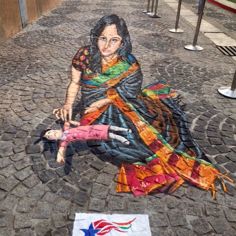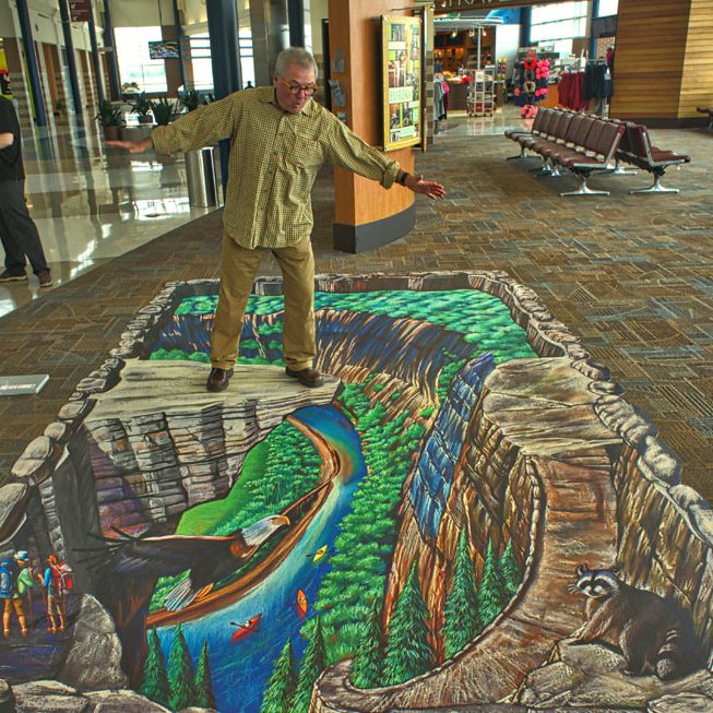 The teapot was the primary inspiration for the piece. In an effort to illustrate that the teapot is virtual and floats in that space, we incorporated a fundamental layout of 3D street painting – with the teapot emerging from that virtual space, which exists below the existing pavement.