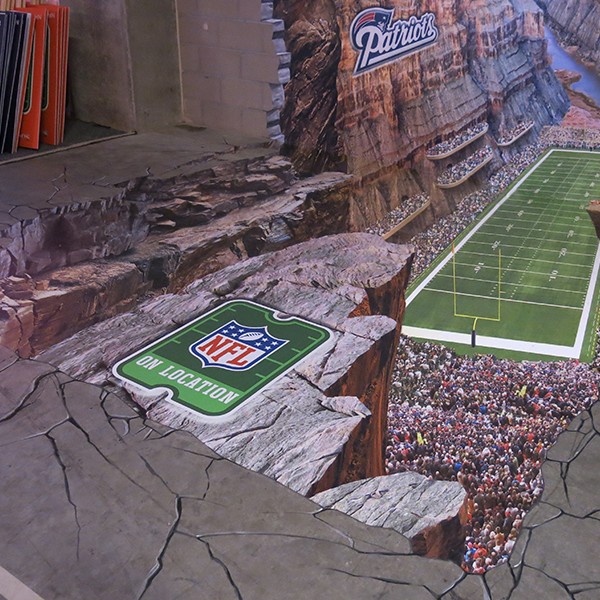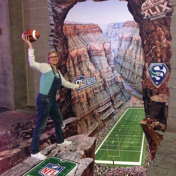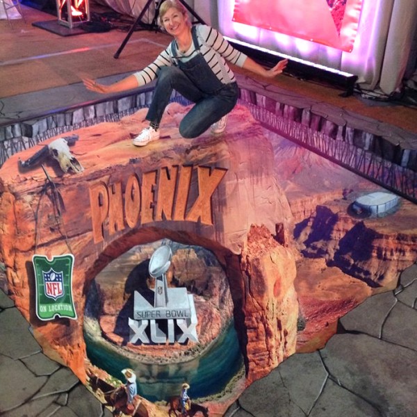 SUPER excited to have participated as a guest artist at America’s premiere sporting event, Super Bowl 49, held this year in beautiful Phoenix, Arizona. With over 114.4 million viewers this year, it was thrilling to present my work to such a huge audience and also to be one of the thousands in the stands to watch the game. Commissioned by the host committee to present works at two VIP stadium venues, I created one floor piece for the Touchdown Canyon pre-game lounge and one wall & floor joint piece for the Super Bowl Valley pre-game lounge. Complete with prop footballs (& cheerleaders!) to encourage the public to play, my team and I snapped hundreds of photos of VIP attendees with the art, which proved to be a winning offering.